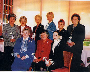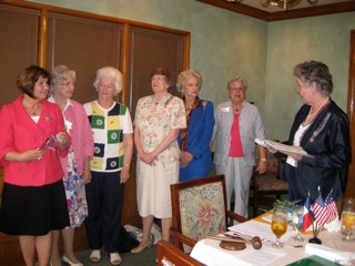 Celeste McEntire, President, Stella Leis, Chaplain, Mary Eck, Recording Secretary, Meem Baumgartner, Treasurer, Barbara Harrell, Registrar Rose Marie Henry, Librarian, and Corinne Staacke installing officers