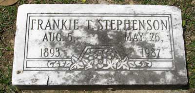 Frankie (Tucker) Stephenson (b. Aug. 5, 1893, Alamo, Tenn.; d. May 26, 1987, Memphis, Tenn.) May 27, 1987, Memphis Commercial Appeal: Mrs. Frankie T. Stephenson, 94, of Memphis, died Tuesday at Baptist Hospital East. Services will be at 1 p.m. Thursday at Memphis Funeral Home Poplar Chapel with burial in Elmwood. She was a member of the Springdale Methodist Church. She leaves a daughter, Mrs. Johnnie Whitaker of Memphis and five grandchildren.