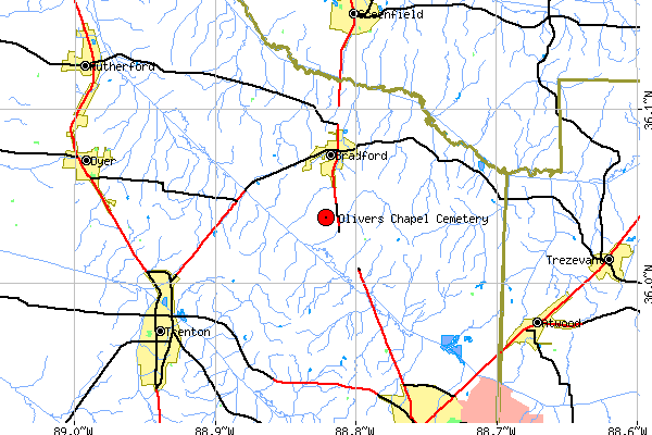 and Hwy 45 (four-lane) turn south toward Milan. Go 3.2 miles to Olivers Chapel Rd.
