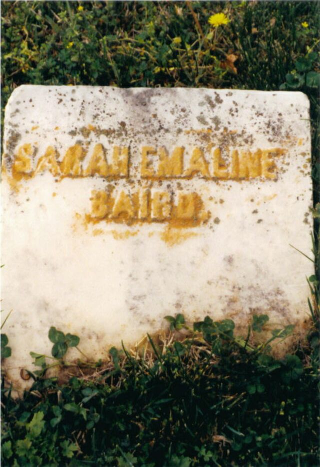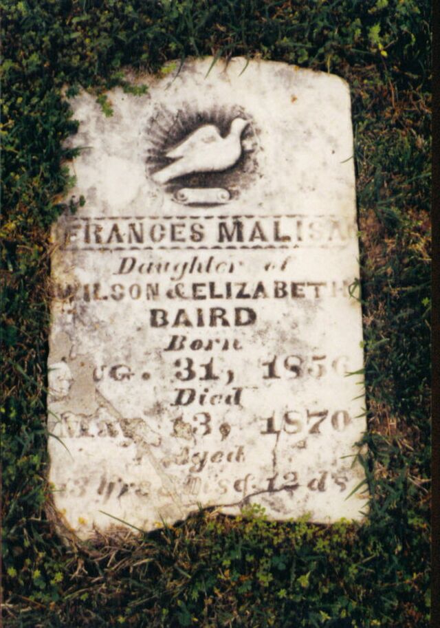 BAIRD, Frances Malisa b. Aug. 31, 1856, d. May 13, 1870 Daughter of Wilson & Elizabeth 13 yrs. 8 m's 12 d'sBAIRD, John Wilson no dates