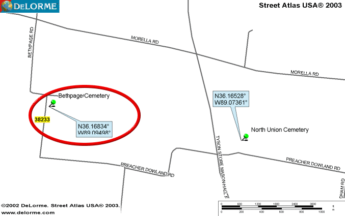 Directions: On Hwy 45 coming in to Kenton from Rutherford, turn left at the 2nd stop sign. This is W. College St. or Mason Hall Road. Go .8 mile. Turn left on Morrella Rd. Go 5.2 miles, then turn left at the Bethpage Baptist Church sign. Go .5 mile and cemetery is on the left.