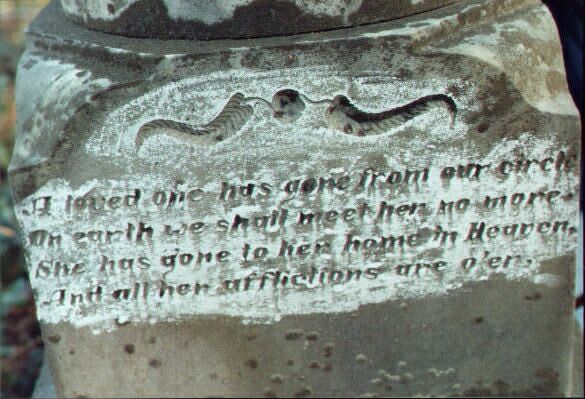 L. Adaline wife of J. M. Witherspoon b. Jan. 9,1843 d. Feb. 25,1873 "Though thou art gone and thy fair form lies moldering in dust, still Adda fond memory clings to thee."
