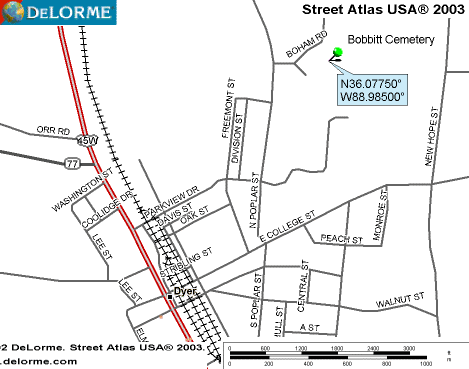 Location: At the 2nd red light in Dyer on Hwy 45W, turn east. Go to 4-way stop at school. Turn left. Go .5 mile. Cemetery is on right, back in a field. This cemetery has both blacks and whites buried here.