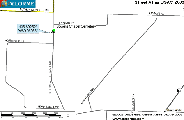 This cemetery is located on the Gibson Wells - Brazil Rd., @ 3.6 miles from the Trenton - Alamo Hwy, and @ 1.7 miles from the intersection of the Gibson Wells - Brazil Rd. and the Frog Jump - Brazil Rd.