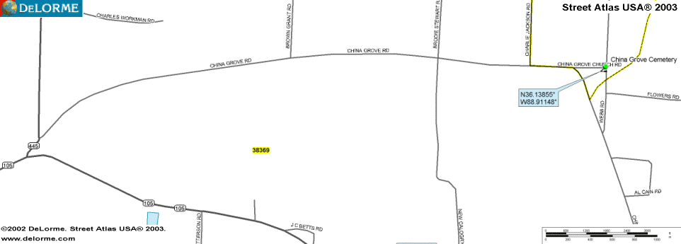 China Grove Church and Cemetery are located east of Rutherford. Go out hwy 105 (Bradford Hwy. ), about a mile out the road will split three ways take the middle fork, this is China Grove Rd. the church and cemetery will be about five miles on right.