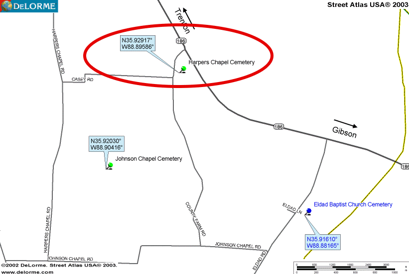 This cemetery is south of Trenton on the Gibson Hwy. (186 N). Going towards Gibson turn right on County Farm Rd. the cemetery is on the left about a hundred yards down. There is only a small part that is kept up, the rest is in the woods. There are many unmarked graves.