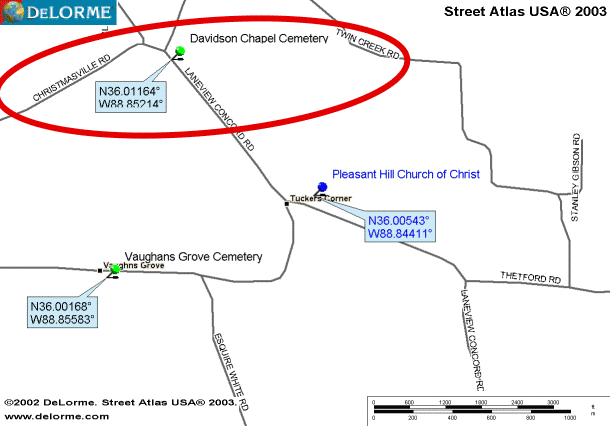 From the 45W Bypass at Trenton, turn East on the Trenton - Milan Hwy, TN 77, go 6.1 miles and turn left onto the Concord - Moores Chapel Rd., go 2.5 miles to the Concord - Cades Rd., turn left and go .1 miles to the Laneview - Concord Rd., turn right and go 2.9 miles to the Church and Cemetery.
