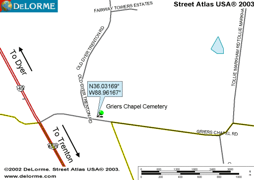 Directions to cemetery: From Trenton at the north end of Hwy 45 By-pass, go 2.1 miles north on Hwy 45W to Grier's Chapel Rd. Turn right. From Dyer at the intersection of Poplar Grove Rd. and Hwy 45W, go 2.4 miles south on Hwy 45W to Grier's Chapel Rd. Turn left. Go .4 miles. Cemetery is on left. Cemetery was established in 1894.