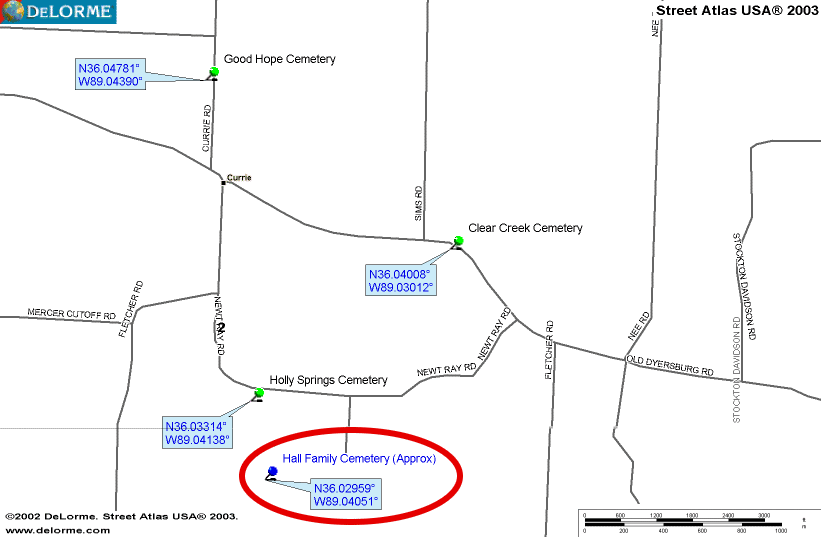 This cemetery is way off the beaten path. Go north out of Trenton on Hwy. 45 turn left on Old Dyersburg Rd. and go 4.4 miles and take Newt Ray Rd. on the left. Follow this .9 of a mile and there will be a field road on the left. Walk down this field road one mile (approx) and the cemetery will be in the woods. It has a new chain link fence around it.