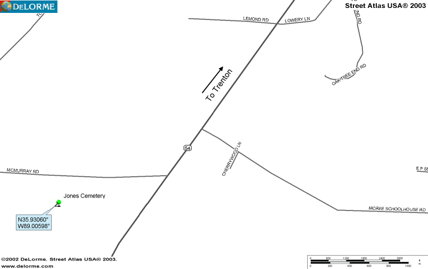 From the intersection of Hwy 45 W and TN 54 at Trenton, turn left onto TN 54, go 3.9 miles, turn right onto McMurry Rd., go .7 miles to # 69 McMurry Rd., just pass the house is a field road to the left, go .2 miles down the field road to the cemetery.