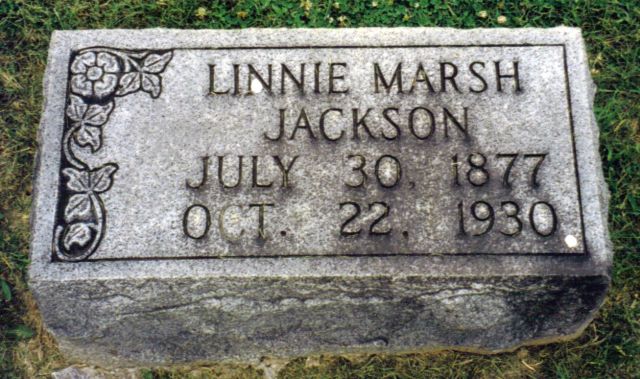 JACKSON, Linnie (Eudora) Marsh b. 30 July 1877 d. 22 Oct 1930 daughter of Thomas Laird and Prudence Paralee (Starkey) Marsh, wife of J. Charles Jackson