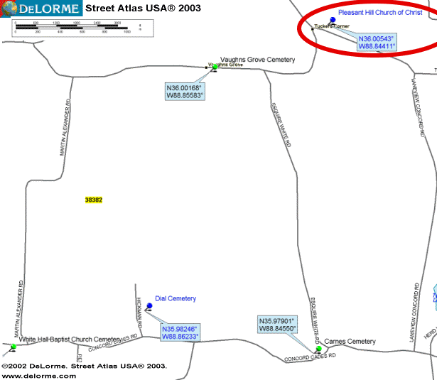 From the US 45 Bypass at Trenton, turn East on the Trenton - Milan Hwy, TN 77, go 6.1 miles & turn left onto the Concord - Moores Chapel Rd., go 2.5 miles to the Concord - Cades Rd., turn left and go .1 miles to the Laneview - Concord Rd., turn right and go 2.1 miles to the Church and Cemetery.