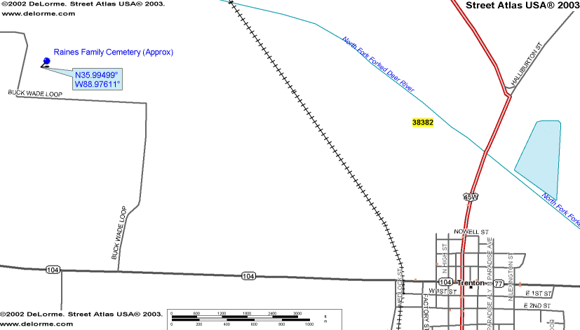 This is a small family plot west of Trenton. Take Hwy. 104 (Dyersburg Hwy) about four miles and turn right onto Buck Wade Loop (gravel). The plot is on the right half way around. It is well kept with a chain link fence.
