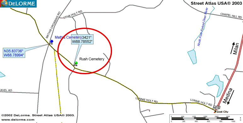 From Milan toward Medina on Hwy 45. Turn right on Goat City Rd. The cemetery is approximately 2 miles on the left. It is a very small untended cemetery right at the road's edge. There is no formal sign naming the cemetery, but considering that all the headstones are "Rust", it seems likely that it would be known by that name.