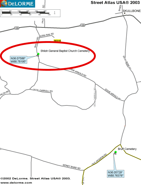 Trezevant for 1.8 miles. Turn right on Shiloh Rd. Go .3 mile and church and cemetery are on the right.