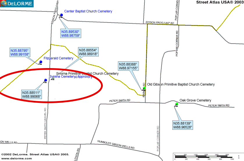 This cemetery is located on the Peter Smith Gravel Road, just across from the Oak Grove Cemetery. It is about 50 yards off the road in a woods lot, many fallen trees, and could only find a few markers, but there were a lot of sunken places, indicating graves, but with no markers.