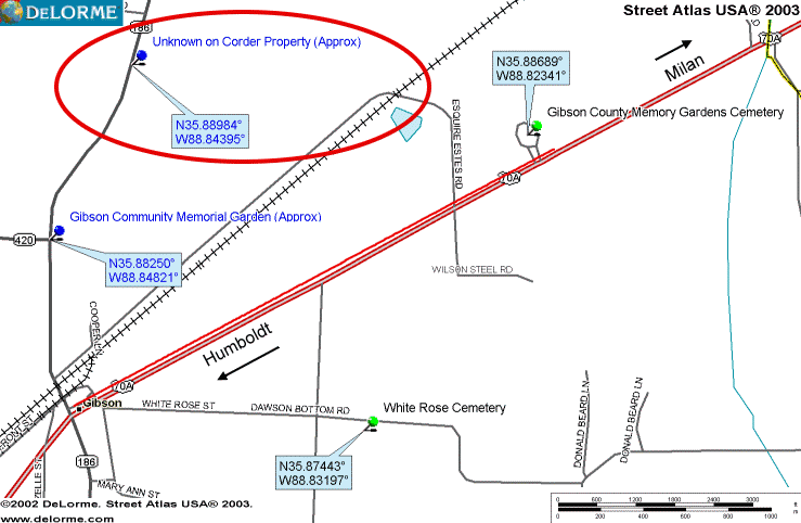stones are located @ 1 mile from RR in Gibson, Tn. on Rt. 186 North, on