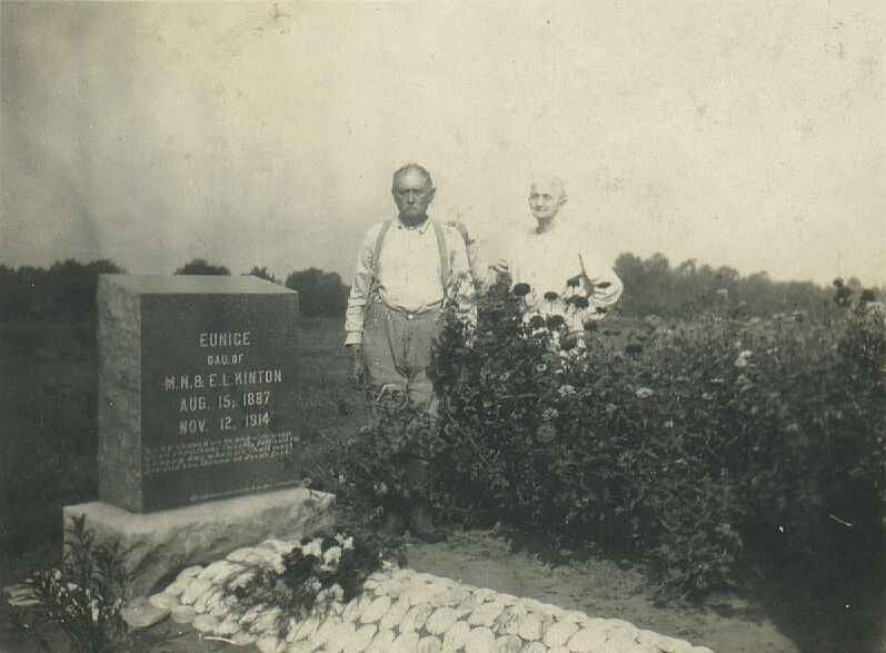 The photo shows Major Neal (Dock) Kinton and his wife Emma Lou Taylor Kinton at the grave of their daughter Eunice Almeda Kinton. Eunice died at the age of twenty-seven from tuberculosis.