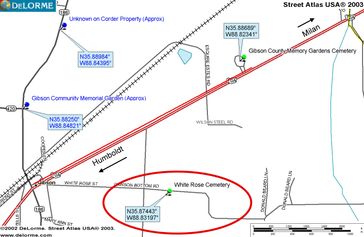 White Rose Cemetery is located southeast of Gibson, Tn. at the intersection of Gibson Cemetery Rd. and Dawson Bottom Rd.