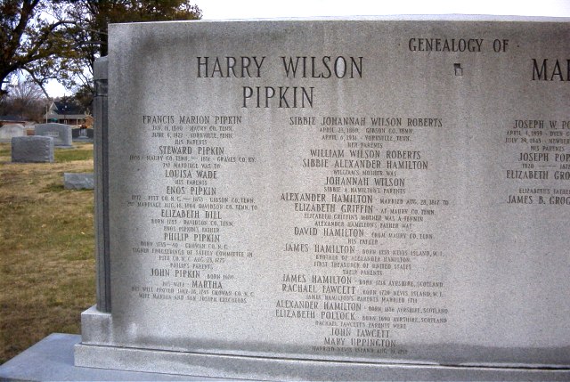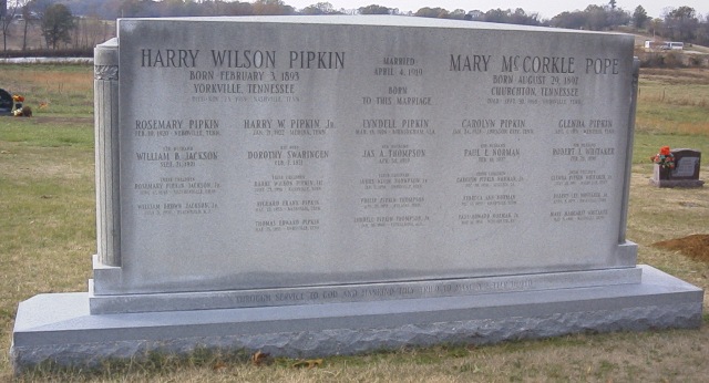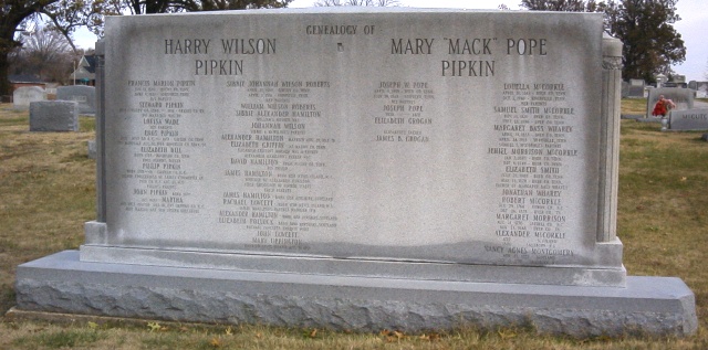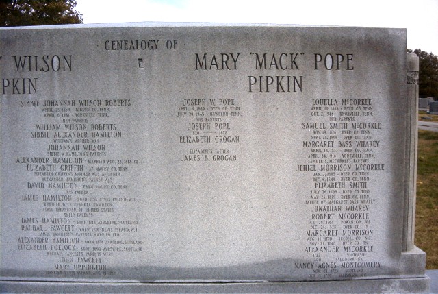 The genealogy of Harry Wilson and Mary McCorkle Pope Pipkin are on the stone: